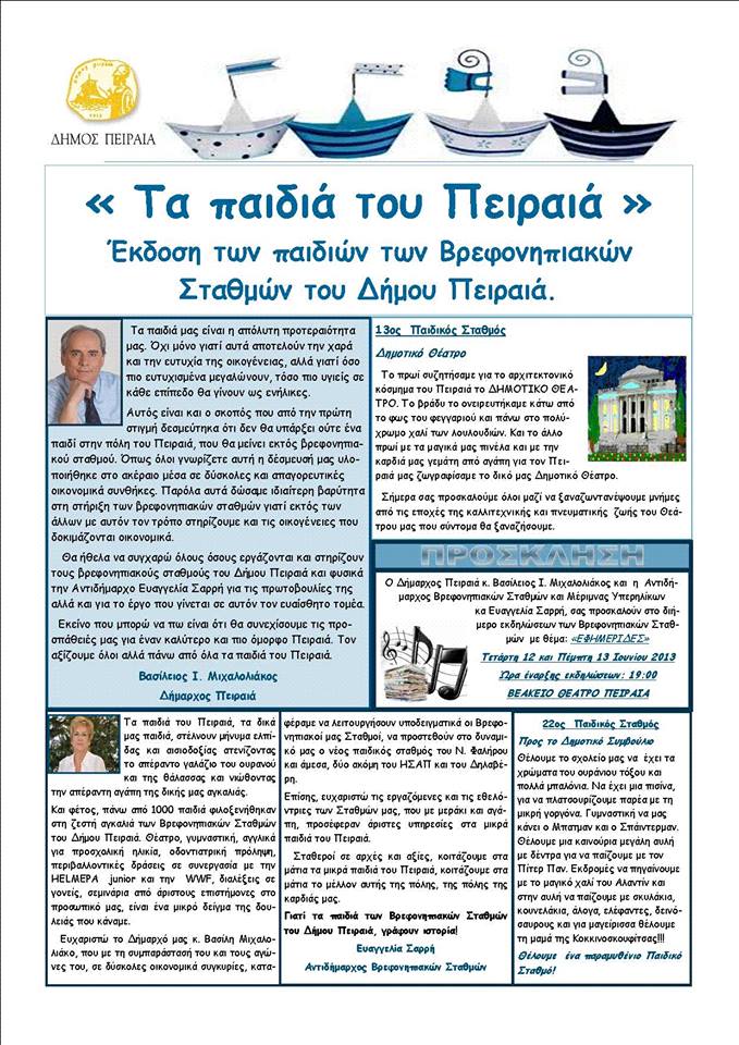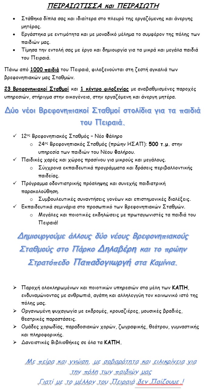 Γιατί όταν σε άλλους δήμους έκλειναν παιδικοί σταθμοί, στο Δήμο του Πειραιά, καταφέραμε και δημιουργήσαμε και δύο καινούργιους, πραγματικά κουκλόσπιτα για τα παιδάκια μας, σε κατάσταση οικονομικής χρεοκοπίας της χώρας και των ελληνικών νοικοκυριών.