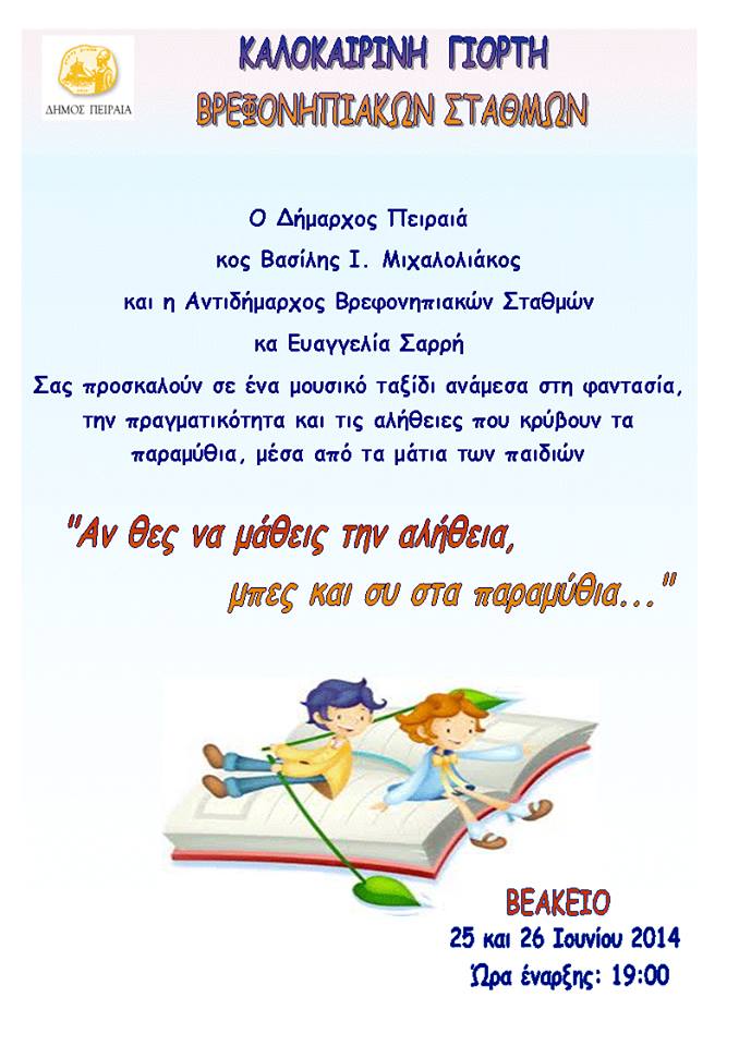 Με μεγάλη επιτυχία πραγματοποιήθηκε η διήμερη Καλοκαιρινή γιορτή των παιδιών των Βρεφονηπιακών Σταθμών του Δήμου Πειραιά, στο Βεάκειο Θέατρο, μετά από πρωτοβουλία του Δημάρχου Πειραιά κ. Βασίλη Μιχαλολιάκου, της Αντιδημάρχου κυρίας Ευαγγελίας Σαρρή και της Διεύθυνσης Βρεφονηπιακών Σταθμών.